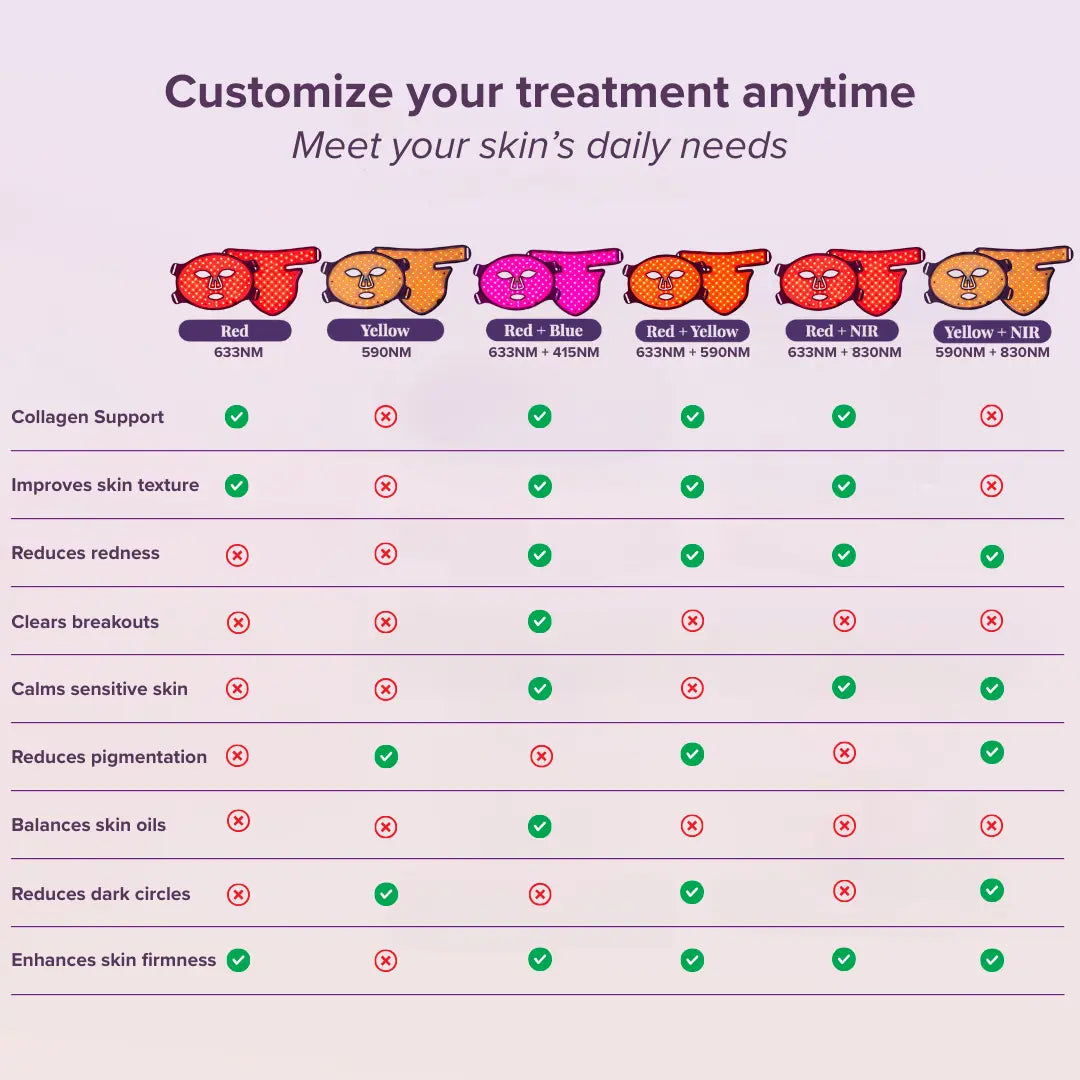 Clinically Proven results; Red (630nm), Blue (415nm), Yellow (590nm), Near Infra red (830nm)